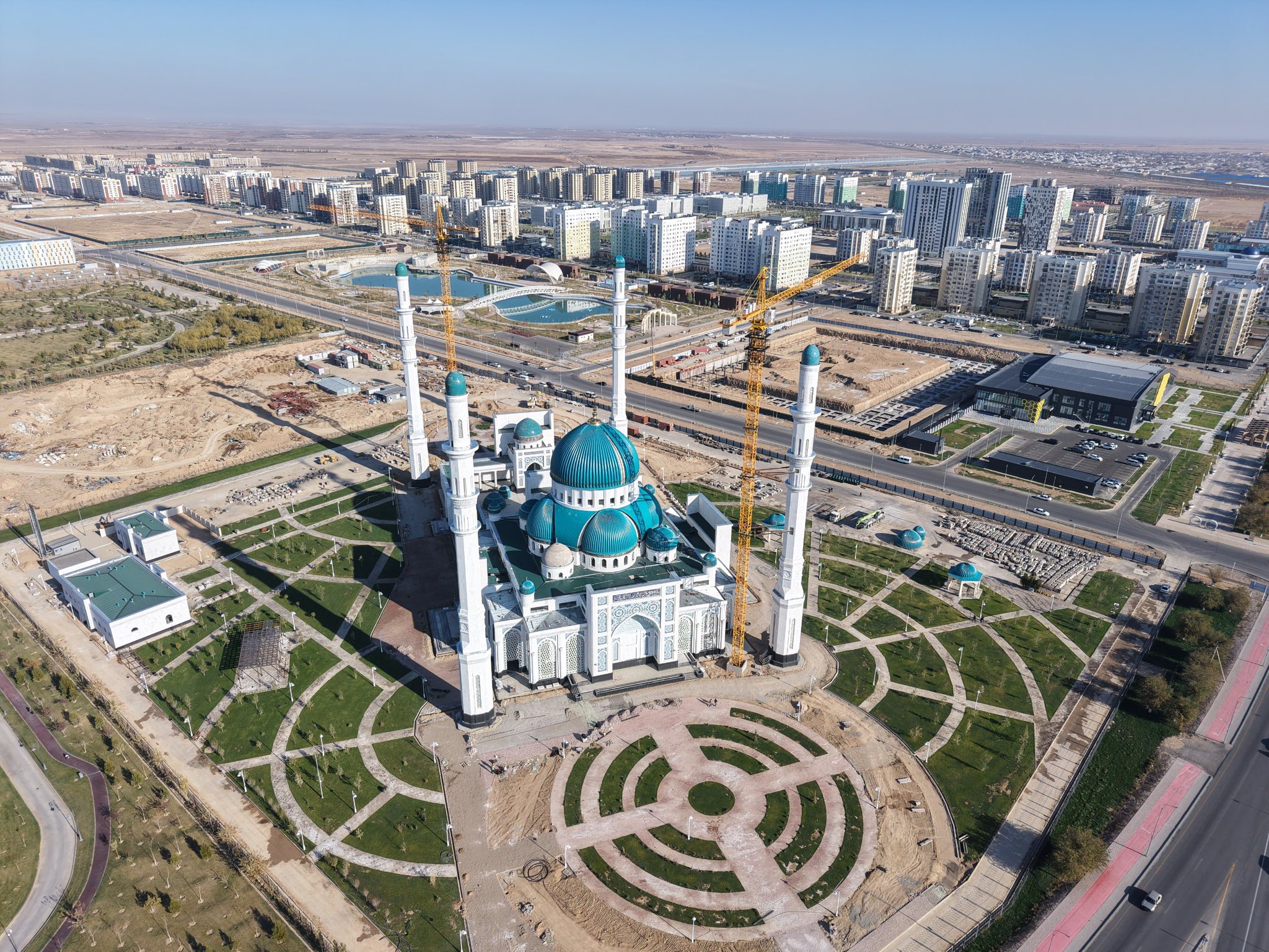 Түркістан қаласына кіреберісте әлемдегі озық тәжірибелерді ұштастырған еңселі мешіттің құрылысы аяқталуға жақын. Қазіргі таңда мешіттің қасбеті, мұнарасы, электрмен және сумен жабдықтау, терезе орнату жұмыстары толық аяқталған. Сонымен қатар ішкі әрлеу жұмыстары жүргізіліп жатыр. Нысан басында 30-дан астам адам мен 9 техника жұмылдырылған. Заман талабына сай салынып жатқан мешіттің құрылыс алаңына облыс әкімі Нұралхан Көшеров арнайы барып, жауапты басшылармен кездесті. Ол жұмысты сапалы және уақтылы аяқтау жөнінде тапсырма берді.